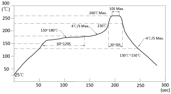 1. We recommend the reflow temperature 245℃ (±5℃).The maximum soldering temperature should be limited to 260℃.